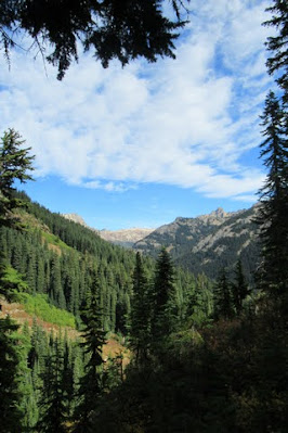 It was a nice quiet, downhill hike back to the car. While it was starting to get a bit dark in the trees, the light on the peaks was just too pretty...