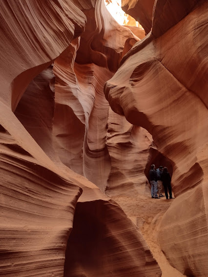 On the Navajo Reservation are two slot canyons: Upper and Lower Antelope Canyon. The Upper Canyon is much more popular and famous. In December of 2014, photographer Peter Lik sold a photo taken there for $6.5 million! But the Upper Canyon is much smaller, the tour is shorter, shallower, and it doesn't have all kinds of ladders/steps. I think we got the better deal... 😁